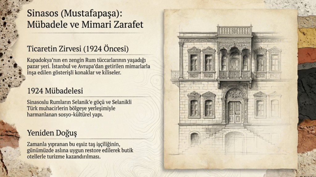 Kapadokya’nın ilk yerleşim yerlerinden biri olan Sinasos özellikle 1924 yılından önce bölgenin en büyük ve önemli bir pazar yeri ve ticaret merkezi, halkı da zengin tüccarlardı.Özellikle mübadele öncesi bölgenin oldukça varlıklı kişileri Sinasos’da yaşamışlar ve kasabaya çok sayıda gösterişli konaklar ve kiliseler yaptırmışlardır.
