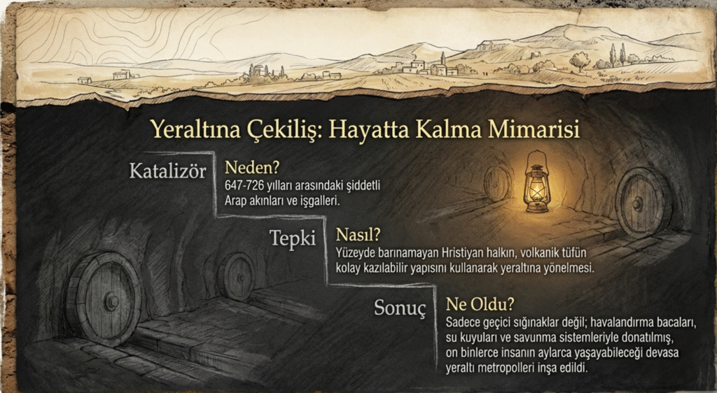 Sonra Anadolu’yu işgal eden Araplar 647-726 Kayseri’yi zaman zaman ele geçirdikleri için buradaki Hıristiyanlar bölge yerleşim yerlerinden Kaymaklı ve Derinkuyu çevresine yerleşerek yeraltı kentlerinde yaşamaya başlamışlardır.