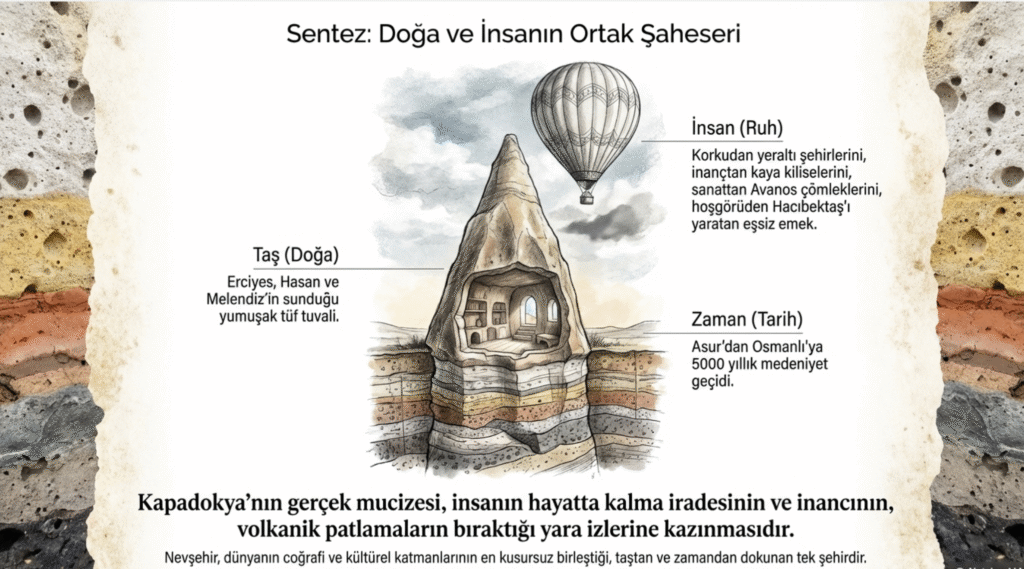 Kapadokya’da taştan ormanların arasında dünyanın eşsiz doğa oluşumlarını –peribacaları, vadileri, kaya oyma mekânları, manastırlar, kiliseleri-görerek hayran olmamak mümkün değildir.