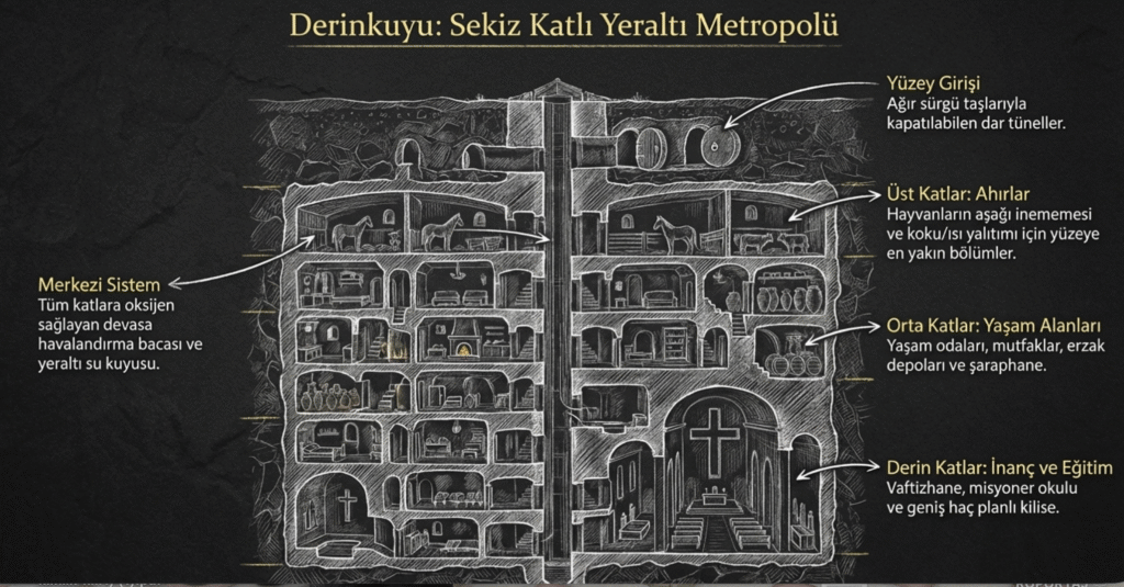 Bölgedeki diğer yeraltı kentlerinde olduğu gibi yüzeyden yerin altına doğru oyularak meydana getirilen Derinkuyu Yeraltı Kenti sekiz kattan oluşmaktadır. Kent – kilise, şarap evi, vaftizhane, aile odaları, havalandırma bacası, depoları, mutfakları, eğitim odaları, kuyusu– bölümlerden meydana gelmektedir.