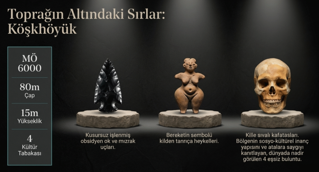 80 m çapında ve 15 m yüksekliğindeki Köşkhöyük’te yapılan kazılarda 4 kültür tabakasında çeşitli tarihi yapı ve yapıtlar- obsidyen aletler- hançer, bıçak, delici, kesici aletler, ok ve mızrak ucu gibi aletler, silahlar vb.- takılar, süs eşyaları- mermer bilezikler, çeşitli renkte taşlardan boncuklar- kilden tanrı-tanrıça heykelleri -bulunmuştur.