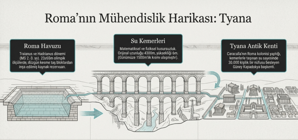 İki kez Güney Kapadokya Krallığı’nın başkentliğini yapan Tyana, en parlak günlerini Roma döneminde yaşamış ve bu döneme ait  su kemerleri matematik, fizik kurallarına uygun yapılmışsa da büyük traverten bloklar arasındaki ince taş işçilik de görülmeye değer niteliktedir.