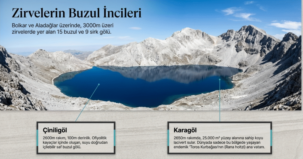 Çiniligöl, Niğde- Bolkar Dağları’nın (21.330 m2 yüzölçüm, 100 m derinlik) en büyük ve ortalama 2600 m yükseklikte (Medetsiz zirvesi-3524 m) bulunan en yüksek buzul göllerindendir. Eğerkaya ve 3524 m Medetsiz de kireçtaşlarının yoğun olduğu alanda çok sayıda göl bulunmaktadır.