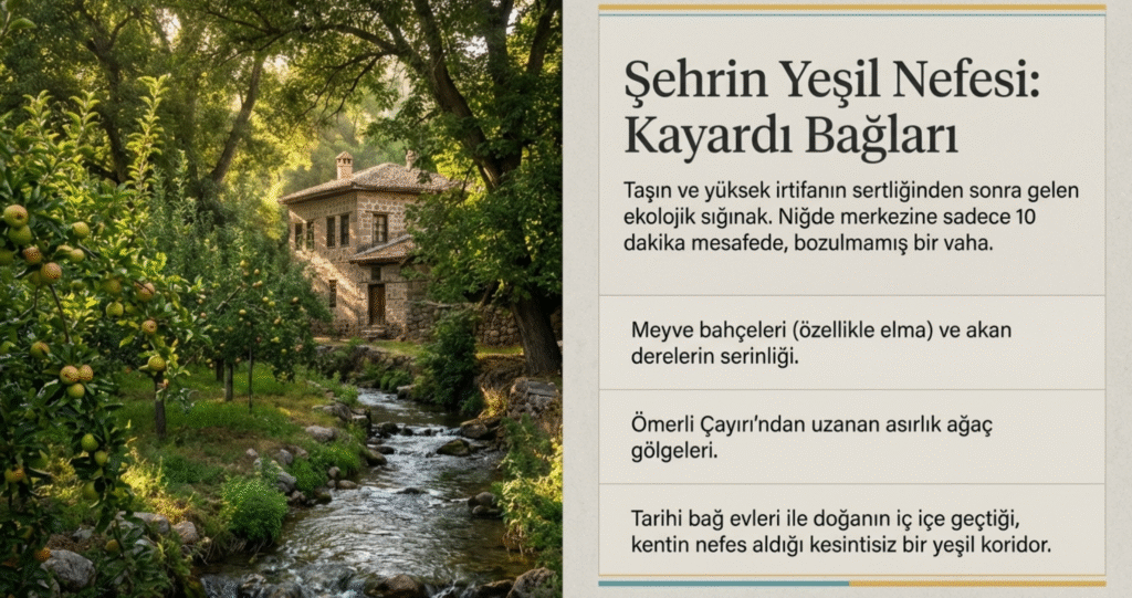 Niğde merkezine 10 dk. mesafedeki Kayardı Bağları, yemyeşil doğası ile kentlinin en gözde mesire alanlarının başında gelmektedir.