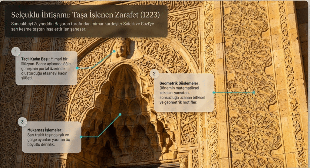En dıştan 28.45 m x 37.10 m ölçülerindeki yapının mimari özelliği, taş işçiliği, bitkisel, geometrik ve figürlü süslemelerinin zenginliği görülmeye değer niteliktedir.