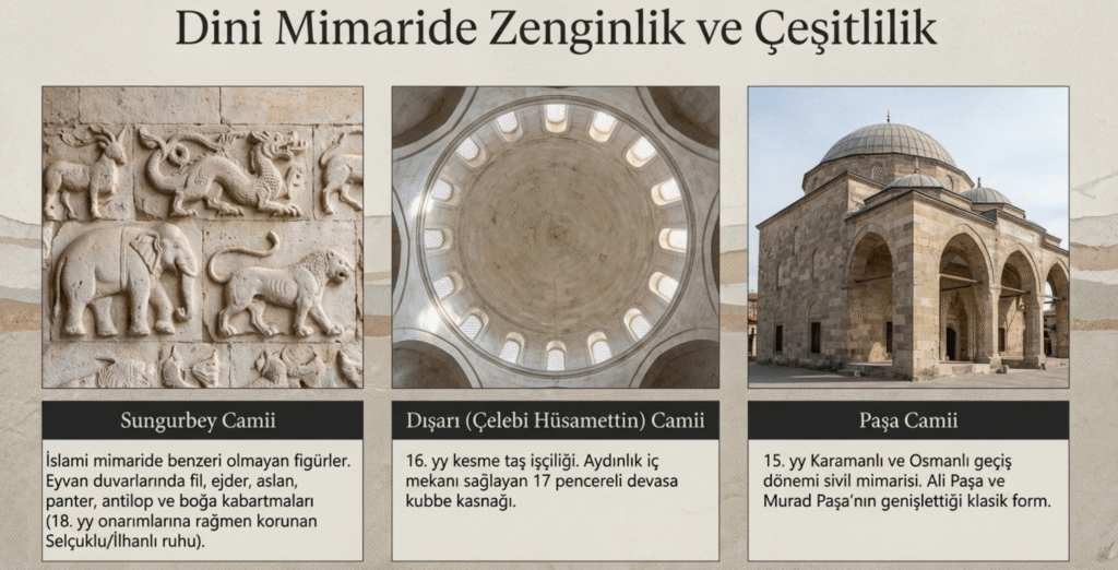 Karamanoğulları dönemi; 15. yy. da Osmanlı yapısı olarak da anılan ve Ali Paşa tarafından yaptırılan sonradan oğlu Murad Paşa tarafından genişletilen, 1909 yılından sonra onarılan yanında türbe ile çeşmenin de bulunduğu Paşa Cami, Karamanoğlu Alaeddin Bey tarafından 1410 yılında, dikdörtgen planlı olarak yaptırılan Bor- Ulu Cami ve Kale Cami, 1413 yılında, kare planlı olarak tasarlanan, tek kubbeli, ince işçilikli sedef kakmalı minbere sahip Şah Mescit, 1452 yılına ait olmasına karşın daha sonra Arife Hanım tarafından onarılan tipik Karamanoğulları yapısı Afife Hanım Mescidi ve Karamanoğlu Alaeddin Ali Bey tarafından 1409’da beyaz mermerden, Selçuklu mimari izleri taşıyan Ak Medrese’nin 1936 yılında onarıldığı bilinmekle beraber yapının geometrik süslemeleri dikkat çekmektedir.