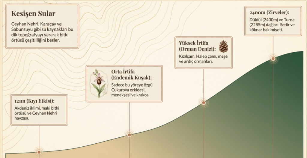 Akdeniz bitki örtüsü makinin ağırlıkta olduğu Osmaniye ili de güneyden kuzeye yükselen dağlar- Amanos (Gâvur) Dumanlı, en yüksek 2400 m Düldül ve 2285 m Turna, Tırtıl ve Toros dağları– ile çevrili olması, nehirlerin çokluğu- Ceyhan Nehri, Kalecik, Karaçay, Kesiksuyu dereleri, Horu (Hamis), Savrun, Sabunsuyu, Yarpuz çayları– bitki örtüsünün çeşitliliğine yol açmaktadır.