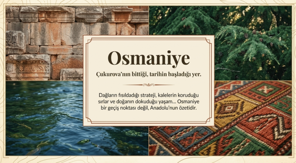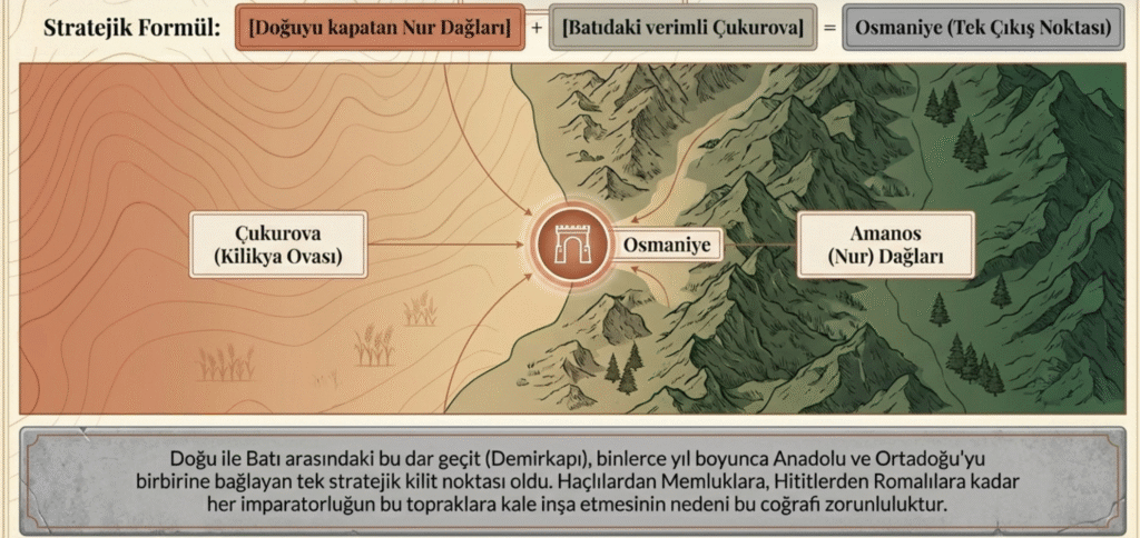 Osmaniye, Nur dağları arasında doğu ile batı arasındaki tek çıkış noktası ve Çukurova’nın bittiği yerdir.