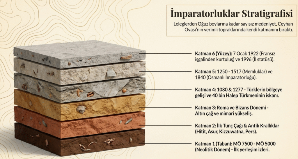 Ceyhan Ovası’nın verimli toprakları içinde yer alan Osmaniye’nin tarihi MÖ 7500- MÖ 5000 neolitik döneme kadar gitmektedir.