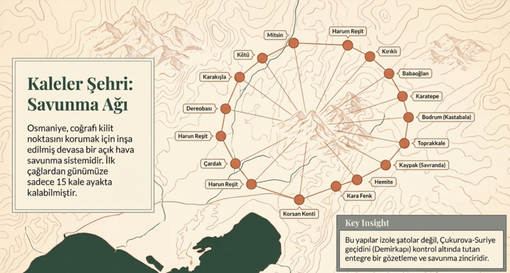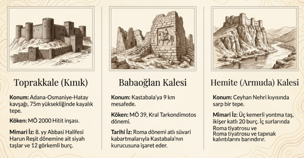 Bugün bu kalelerden sadece 15 tanesi- Mitsin, Kötü, Karakışla, Kırıklı, Dereobası, Babaoğlan, Karatepe, Bodrum (Kastabola), Toprakkale, Hemite, Kaypak (Savranda), Çardak, Kara Fenk, Harun Reşit kaleleri ve Korsan Kenti– ayakta kalabilmiştir.