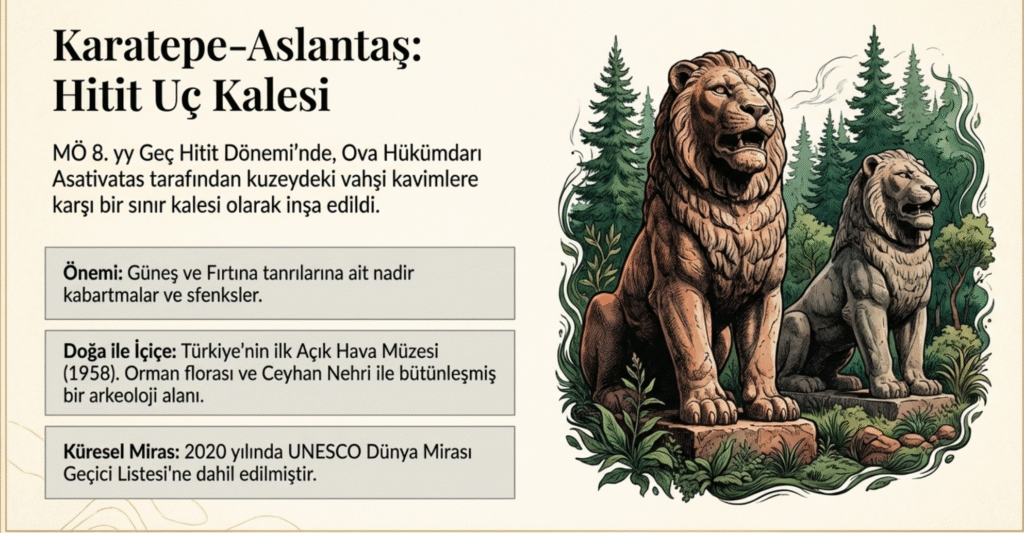 Karatepe- Aslantaş MÖ 8. yy. Geç Hitit Dönemi’nde, Ova Hükümdarı Asativatas tarafından kuzeydeki vahşi kavimlere karşı korunmak amacıyla bir sınır kalesi olarak yaptırılmıştır.