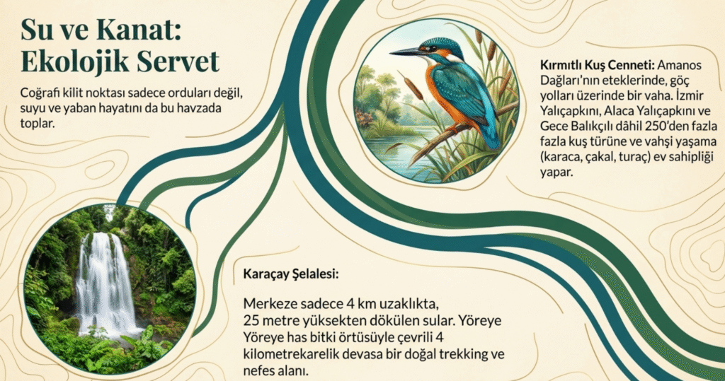 Türkiye’de önemli kuş alanlarından olan Kırmıtlı Kuş Cenneti, Amanos dağlarının yüksek kesimlerimde yer almakta ve içinde yaklaşık 250 farklı kuş türünü- Gece Balıkçılı, Yalıçapkını, Alaca Yalıçapkını ve İzmir Yalıçapkını- barındırmaktadır.