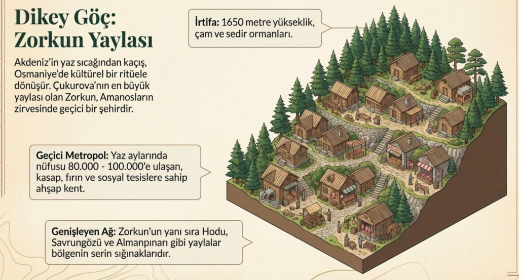 Çukurova’nın en büyük yaylası, 1650 m yükseklikte, ormanlık alandaki Zorkun Yaylası, Amanos Dağları üzerinde yer almaktadır.