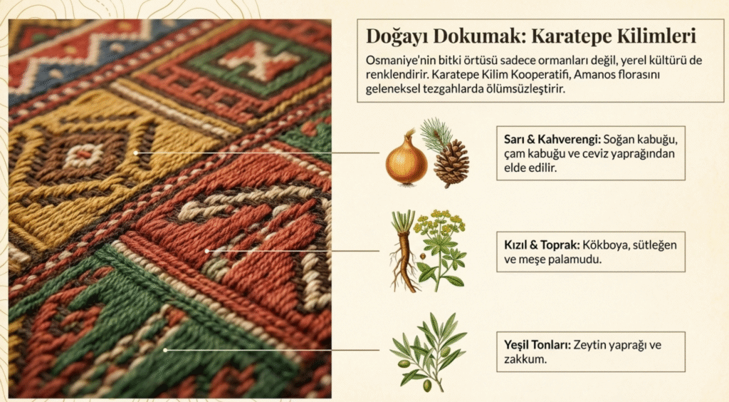 Karatepe Kilimleri, ceviz, sütleğen, hardal, meşe, boruk, devecik, zakkum, gelincik, sakızlık, hartlap, zeytin gibi bitkilerle, çam ve soğan kabuğundan elde edillen doğal boyalar ve geleneksel motiflerle dokunan kilimleri görmek son derece keyiflidir.
