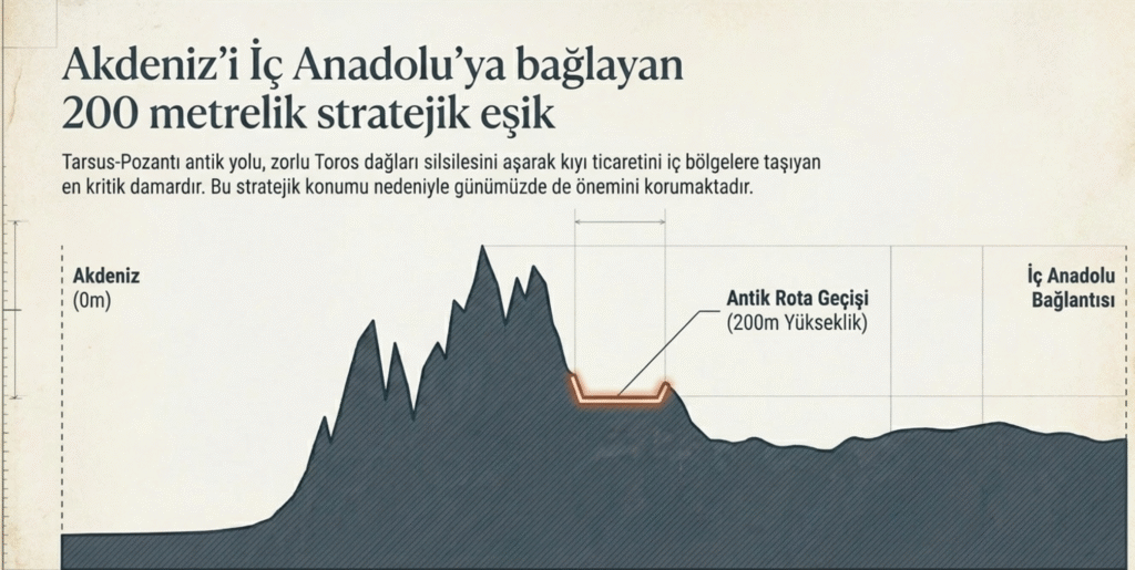 Yolların en önemlilerinden biri de denizden 200 m yükseklikte Akdeniz’i Toroslarla İç Anadolu’ya bağlayan ve günümüzde de önemini koruyan Tarsus- Pozantı antik yoldur.