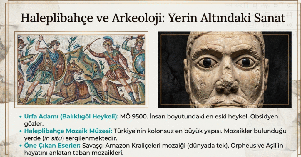 İl merkezi, Eyyübiye ilçesinde, 6.000 m2’lik alanıyla Türkiye’nin kolonsuz en büyük yapısı, Haleplibahçe Mozaik Müzesi’de bulunan mozaikler orijinal yerlerinde sergilenmektedir.