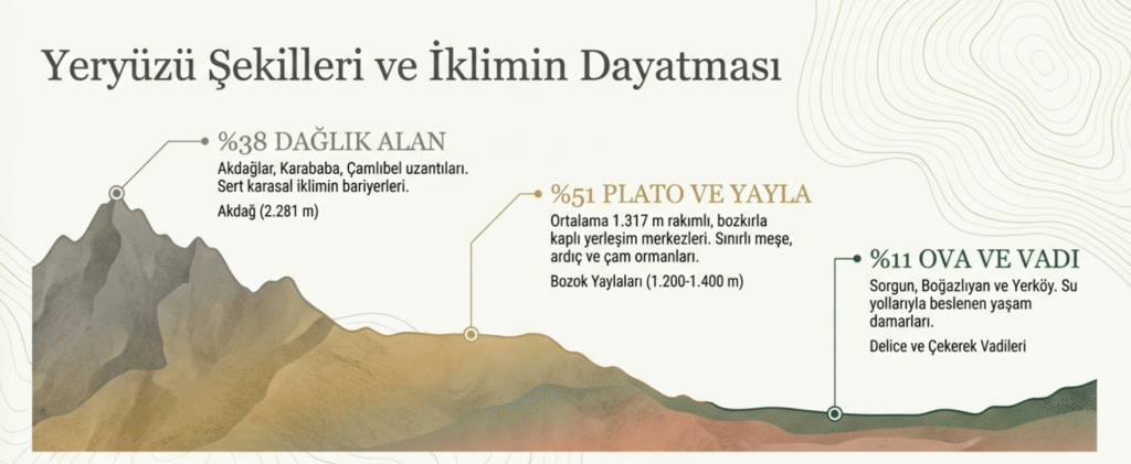 % 51 platolar ve yaylalar 1200 m- 1400 m yükseklikteki- Akdağlar, Bozok yaylaları- vadiler- Delice Irmak ve Çekerek Suyu vadileri– nehir, ırmak ve çaylarla -Delice Irmağı, Yeşilırmak- Çekerek, Kanat, Sorgun suları– ile beslenen % 11 ovalardaSorgun, Boğazlıyan, Şefaatli ve Yerköy ovaları–  yerleşim görülmektedir.
