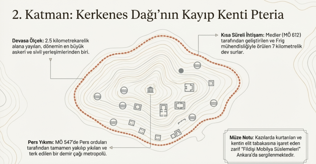 Şahmuratlı Köyü yakınlarında, Kerkenes Dağı eteklerinde kurulan ve yakın zamanda keşfedilen bu yüzden kayıp kent olarak da anılan Pteria’da yerleşimin bulunanlardan çok daha eskilere gittiği tahmin edilmektedir.
