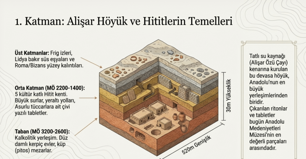 Anadolu’nun doğu -batı, kuzey- güney kavşak noktasındaki Alişar’ın MÖ 3200- MÖ 2600 kalkolitik ardından Hititler ve diğer uygarlıklarla devam eden yerleşim yeri olma özelliğini korumasına neden olmuştur.