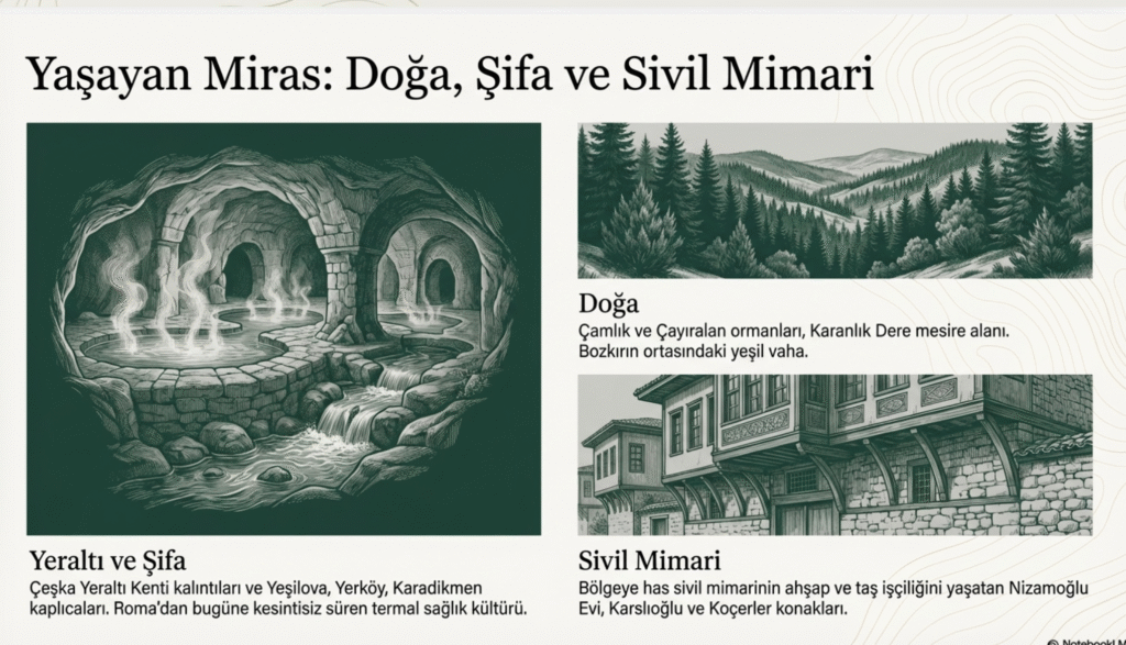 Ayrıca Yozgat ve çevresinde görülmesi gereken doğal yaşam alanlarından Çeşka Yeraltı Kenti, Çamlık, Çayıralan ormanları, Karanlık Dere mesire alanı, Akdağ Ormanlık alanları, kent çevresindeki Sarıkaya, Karadikmen, Yerköy kaplıcaları ile Yeşilova içmeleri önemli sağlık sularıdır.