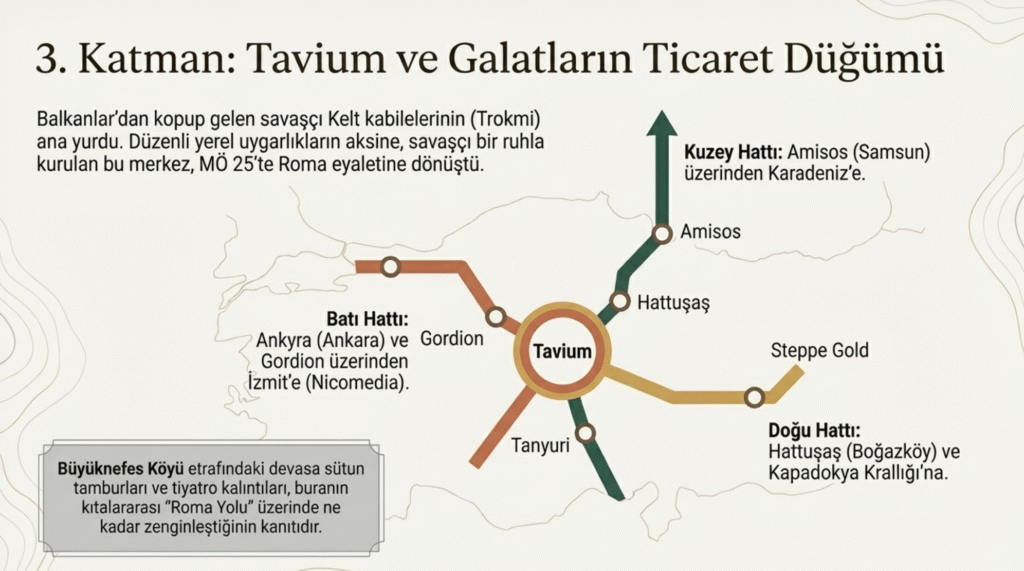 Galatlar her ne kadar gittikleri yerin özelikle Anadolu’da kurulan kadim ve düzenli uygarlıkların -Hitit, Frig, Lidya, Hellen, Kapadokya Krallığı, Roma, Bizans  vb.-yaşadıkları kentlerin düzenini bozsalar da Asya- Suriye ve Karadeniz arasındaki Ticaret Yolu- Roma Yolu – İzmit- Nicomedia, İznik- Nikoia, Eskişehir-Dorylaion, Germa, Ankara, Gordion- Ankyra, Boğazköy- Hattuşaş, Alaca- Karissa, Samsun- Amisos, Kırşehir- Mokissos- üzerinde yer alan Tavium’u ticaret merkezi olarak kullanmışlardır.